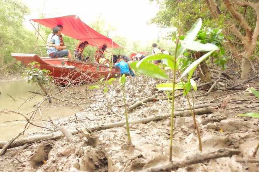 carrying and planting young mangrove plants in the wet fields covered in mud. The mangrove